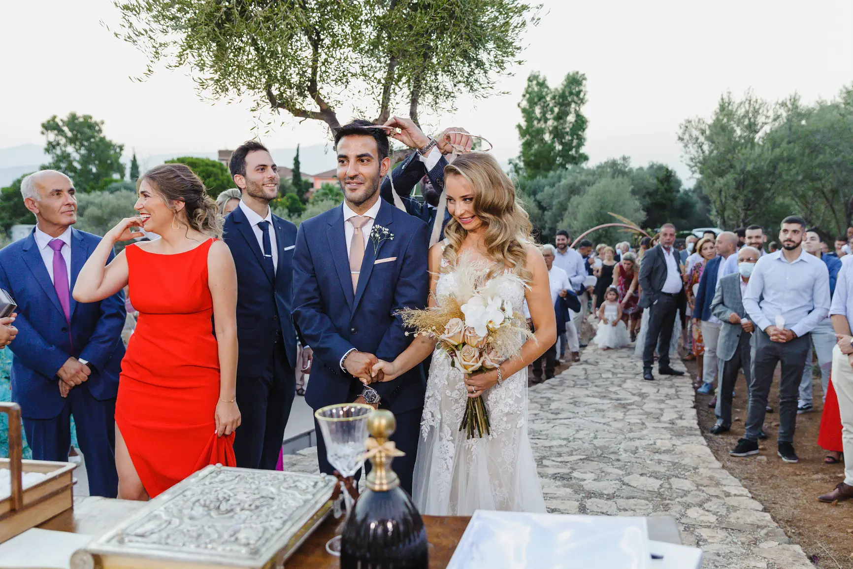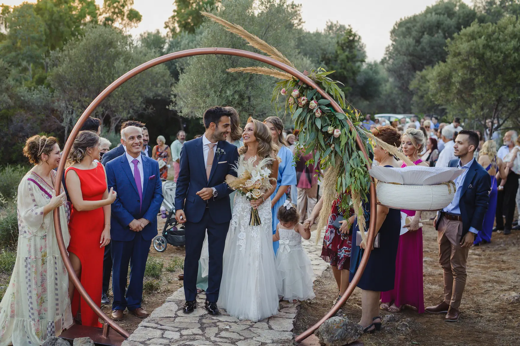 Το Κτήμα Ηλίου Πέτρα, με τους προσεγμένους του χώρους, την πέτρα και το άφθονο πράσινο, δημιούργησε την ιδανική ατμόσφαιρα για την πιο σημαντική ημέρα της ζωής τους. Η τελετή ήταν βαθιά συγκινητική, με τον Χάρη και τη Γιούλη να ανταλλάσσουν όρκους αιώνιας αγάπης και αφοσίωσης, κάτω από τον καθαρό ουρανό, περιτριγυρισμένοι από τα αγαπημένα τους πρόσωπα. Η ευτυχία ήταν ζωγραφισμένη στα πρόσωπά τους, μεταδίδοντας χαρά σε όλους τους παρευρισκόμενους.