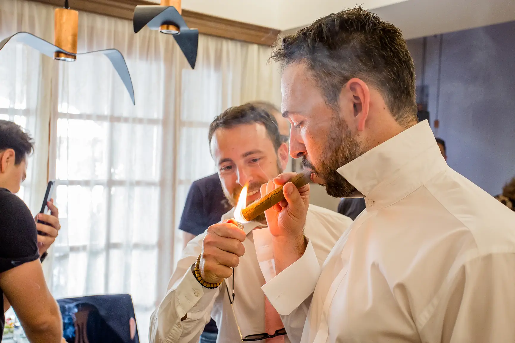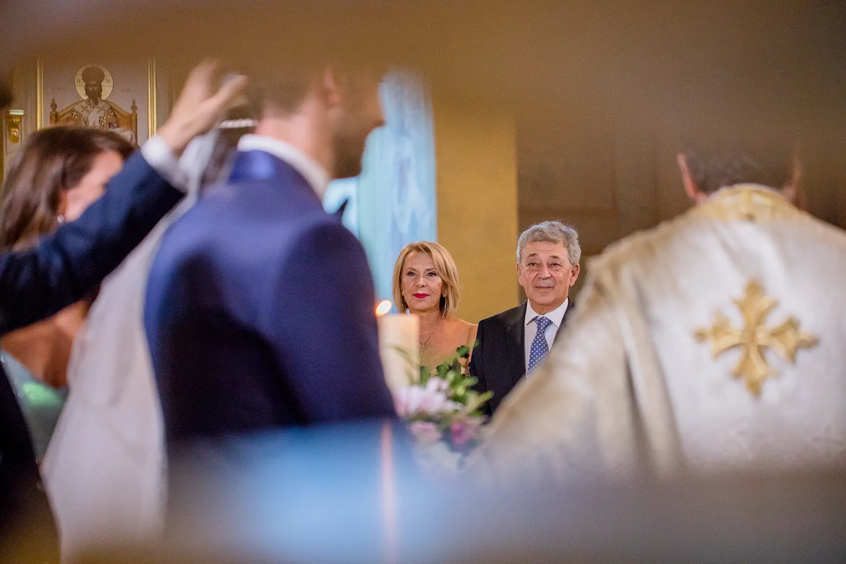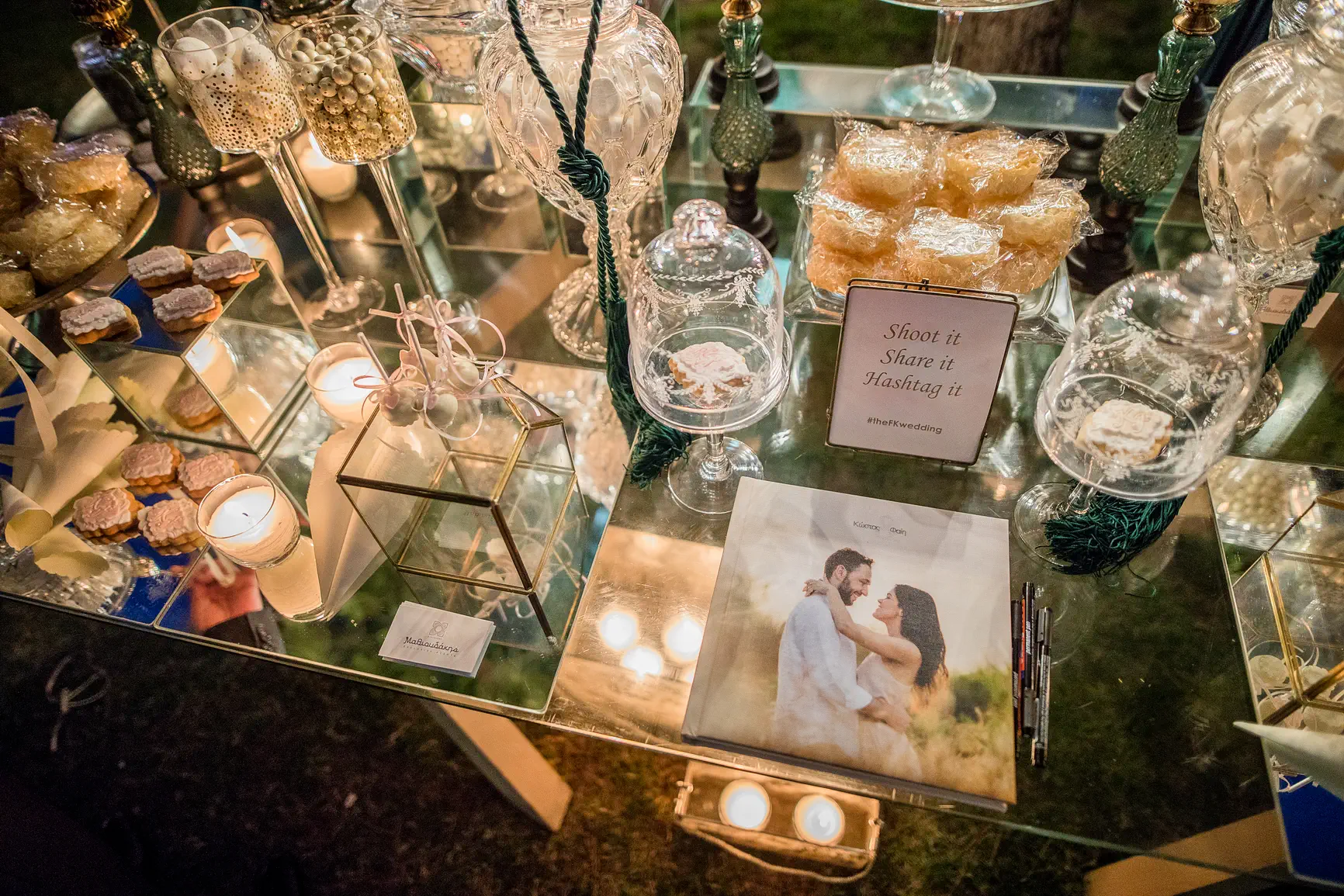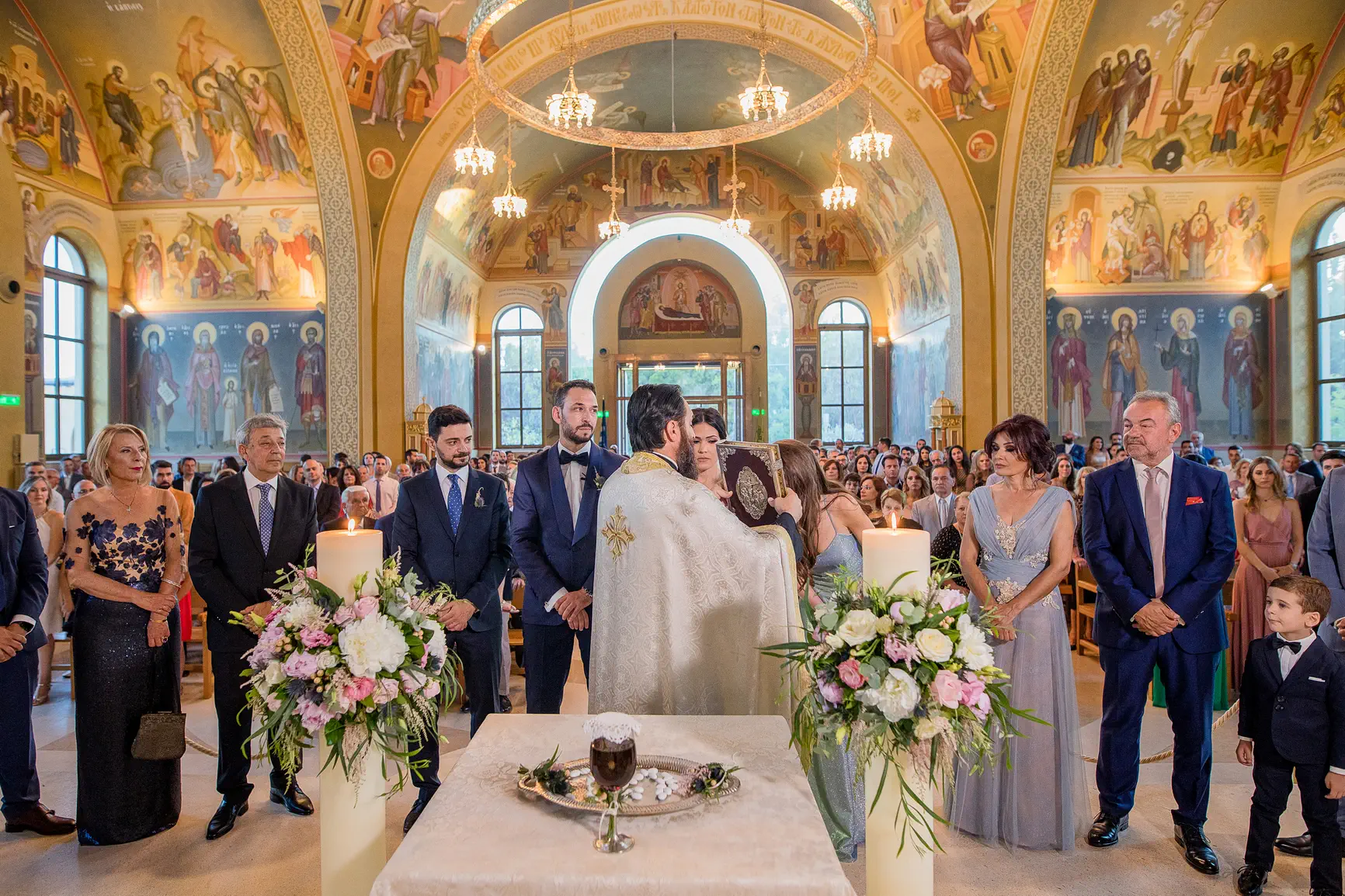 Οι παστέλ αποχρώσεις κυριαρχούσαν διακριτικά, προσδίδοντας μια νότα ονειρικής ρομαντζάδας στη μέρα. Απαλά ροζ, γαλάζια, βεραμάν και λιλά άνθη στόλιζαν τις λαμπάδες και τα μπουκέτα, ενώ οι μικρές λεπτομέρειες αντανακλούσαν την κομψότητα και το προσωπικό στυλ του Κώστα και της Φαίης. Η αύρα της θάλασσας που βρισκόταν σε απόσταση αναπνοής συμπλήρωνε το ονειρικό σκηνικό.