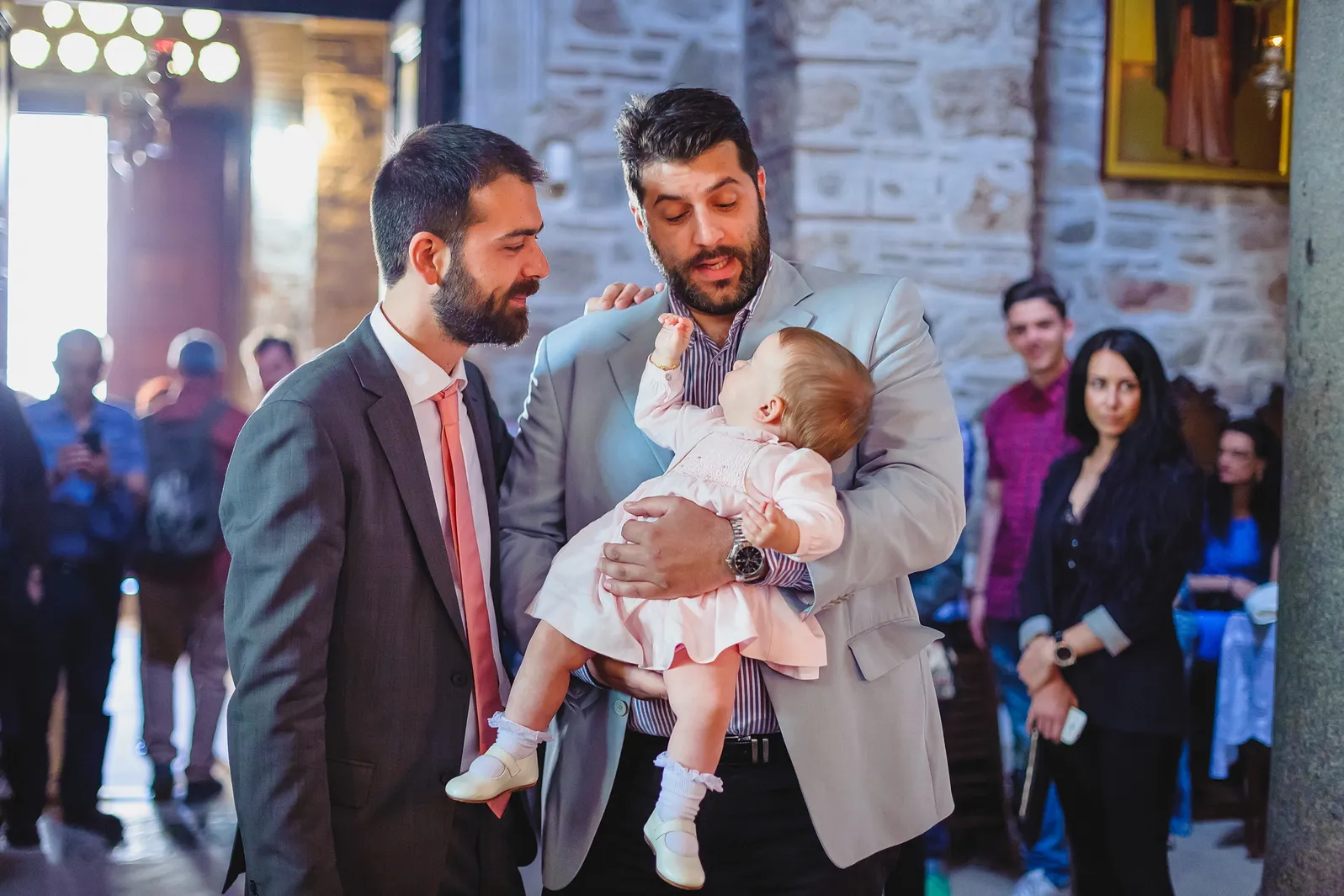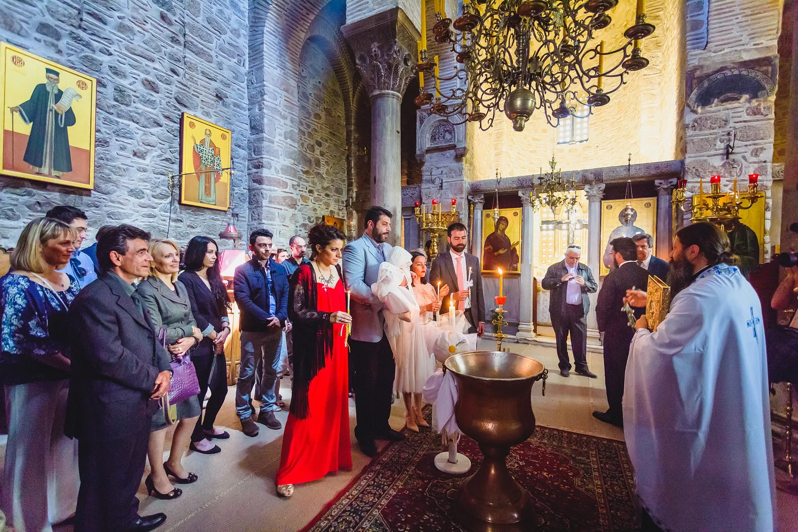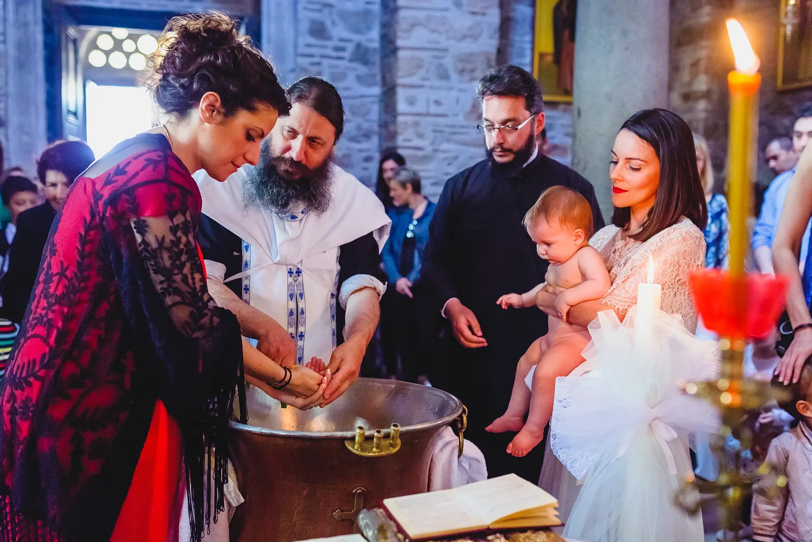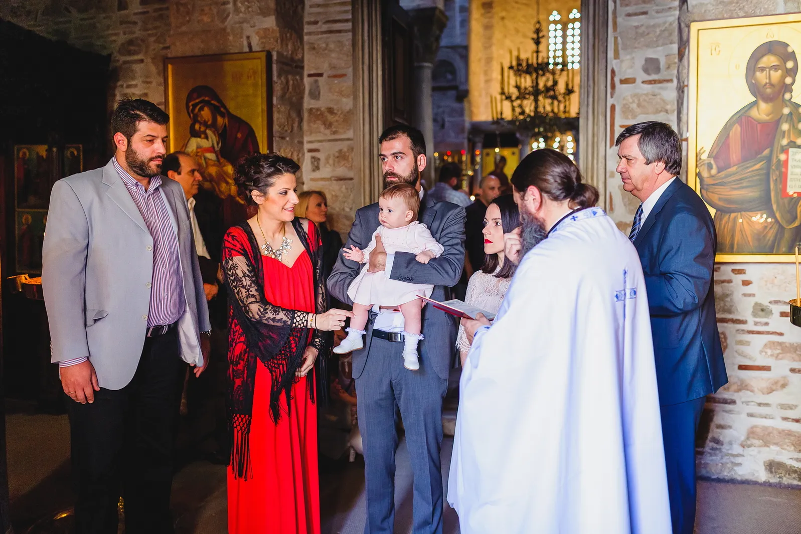 Η ατμόσφαιρα εντός του Καθολικού της Μονής ήταν μοναδική. Οι ακτίνες του ήλιου που περνούσαν από τα παράθυρα φώτιζαν τα ανεκτίμητα ψηφιδωτά και τις τοιχογραφίες, δημιουργώντας ένα περιβάλλον γεμάτο δέος και ιερότητα. Μέσα σε αυτό το σκηνικό, η Εβελίνα, ήρεμη στην αγκαλιά των γονιών και των νονών της, βαπτίστηκε, λαμβάνοντας το όνομά της και την ευλογία της Εκκλησίας. Η συγκίνηση ήταν ζωγραφισμένη στα πρόσωπα όλων των παρευρισκομένων, καθώς γίνονταν μάρτυρες της έναρξης του πνευματικού ταξιδιού της μικρής, σε έναν χώρο που αποπνέει πίστη και παράδοση.
