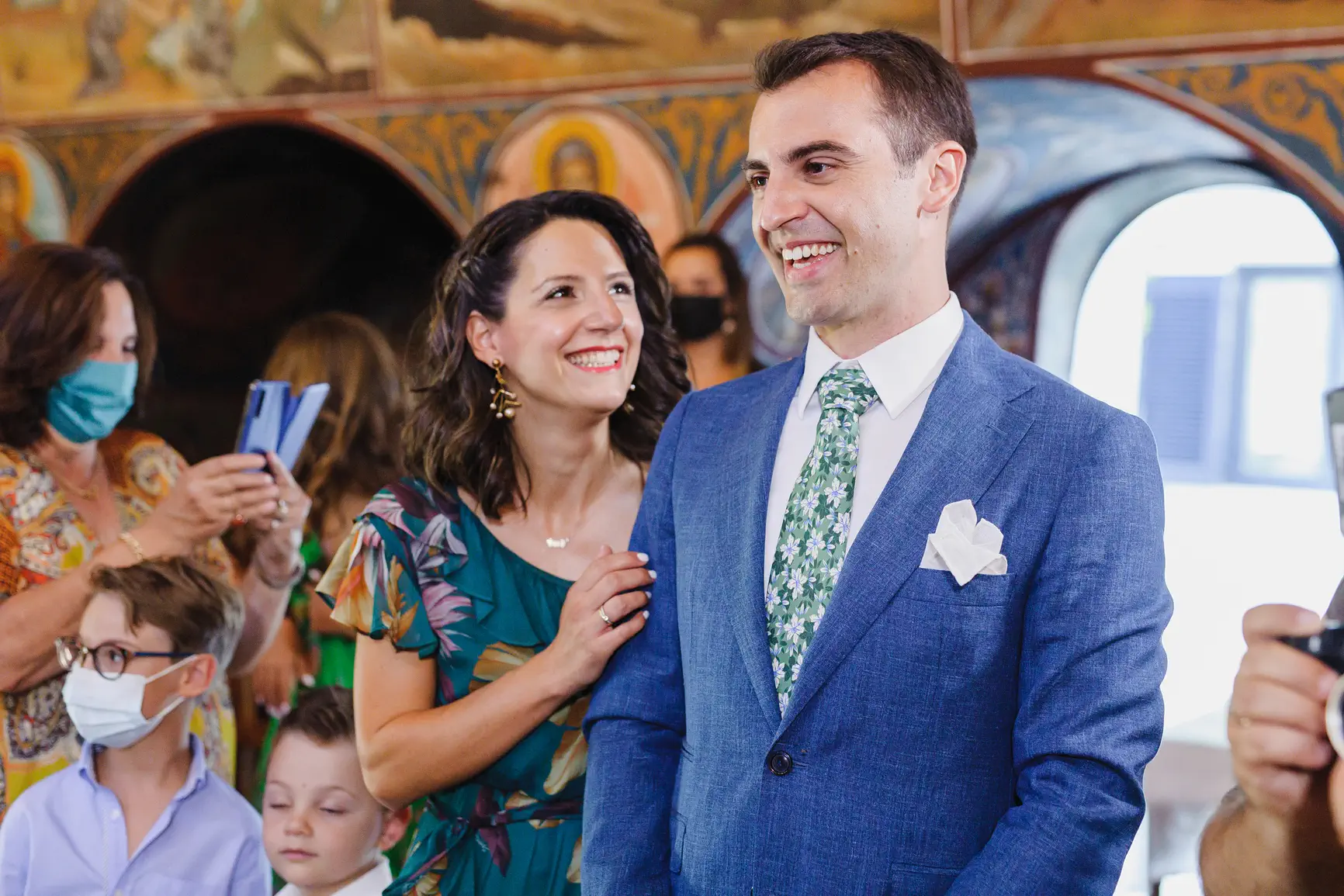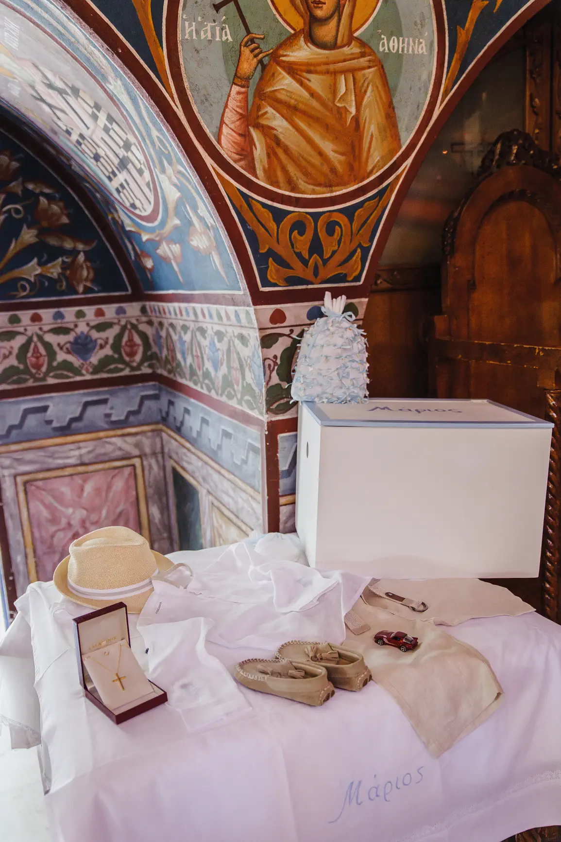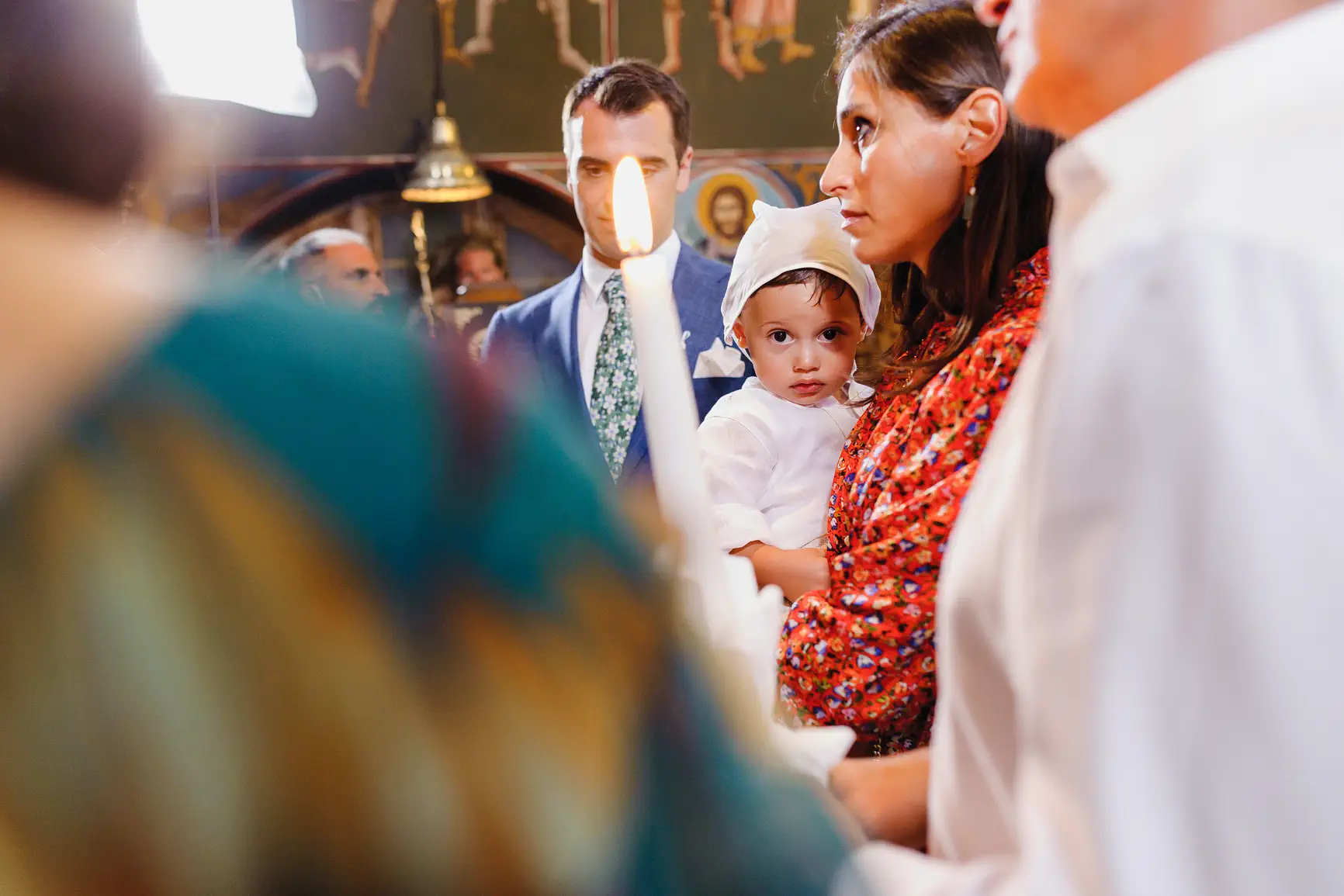 Το Μυστήριο τελέστηκε στο γραφικό και γαλήνιο εξωκλήσι του Αγίου Γεωργίου στο Καβούρι. Με τη θάλασσα να λαμπυρίζει στο βάθος, η ατμόσφαιρα ήταν κατανυκτική και γεμάτη συγκίνηση. Ο Μάριος, ο πρωταγωνιστής της ημέρας, δέχτηκε το όνομά του και την ευλογία της Εκκλησίας, αγκαλιασμένος από την αγάπη των γονιών και των νονών του. Τα βλέμματα τρυφερότητας, τα χαμόγελα και τα δάκρυα χαράς των παρευρισκομένων μαρτυρούσαν τη σημασία της στιγμής, καθώς ο μικρός Μάριος ξεκινούσε επίσημα το πνευματικό του ταξίδι.